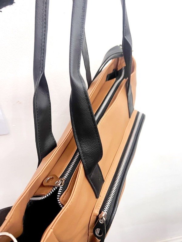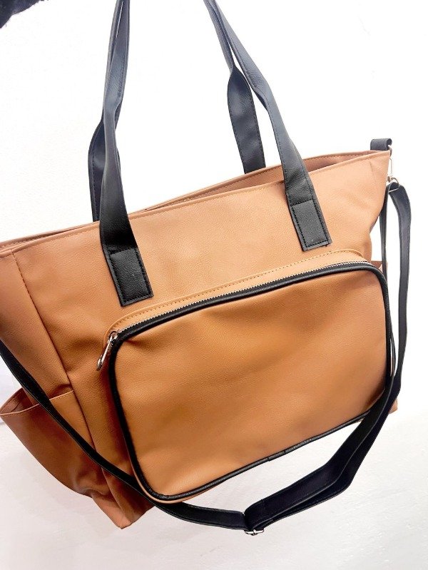 Tote bag marron con correas en el medio.Bolsillos en los laterales para botella de agua.Un solo bolsillo con cierre reforzado.